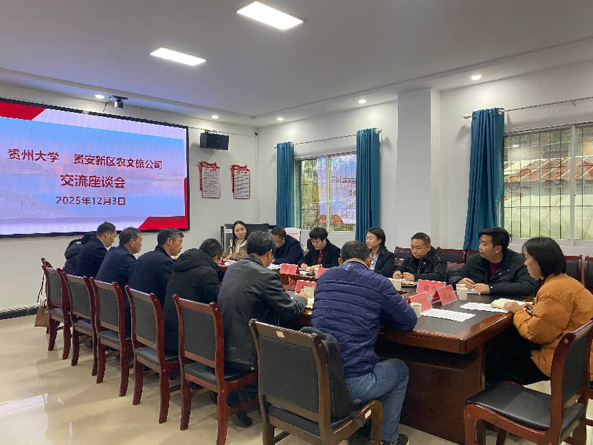 2025年12月3日下午,为深化校企合作,推动产学研协同创新,教学实验场与贵安新区农业文化旅游产业发展有限公司举行交流座谈会。贵安新区产控集团党委副书记赵蓉、贵安新区农业文化旅游产业发展有限公司董事长彭国婧、总经理王键及相关部门负责人一行6人到访教学实验场。贵州大学农学院副院长李鲁华,教学实验场场长陈祥、副场长龙友华、宋章会及相关专家参加交流座谈会议。
